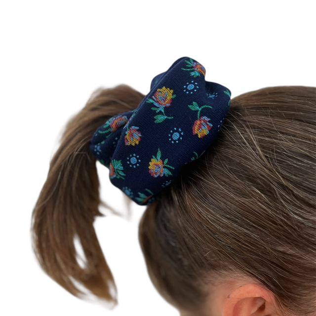 Ce chouchou large est cousu à partir d’un véritable tissu des années 70, revalorisé avec soin.