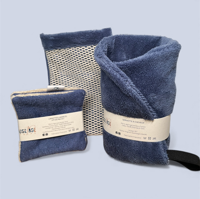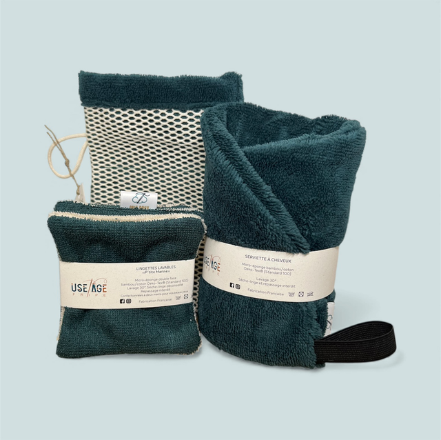 Ensemble Bain Douceur – serviette à cheveux ajustable, Gant & Lingettes | Éponge bambou Oeko-Tex Classe 1