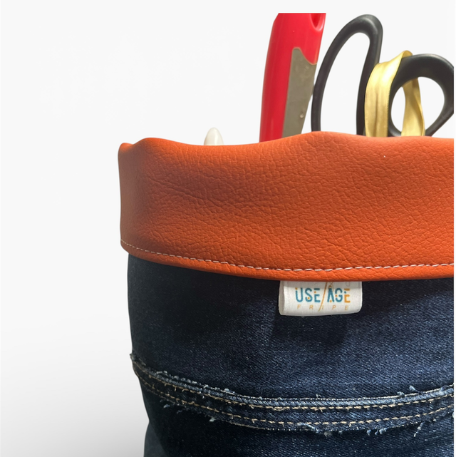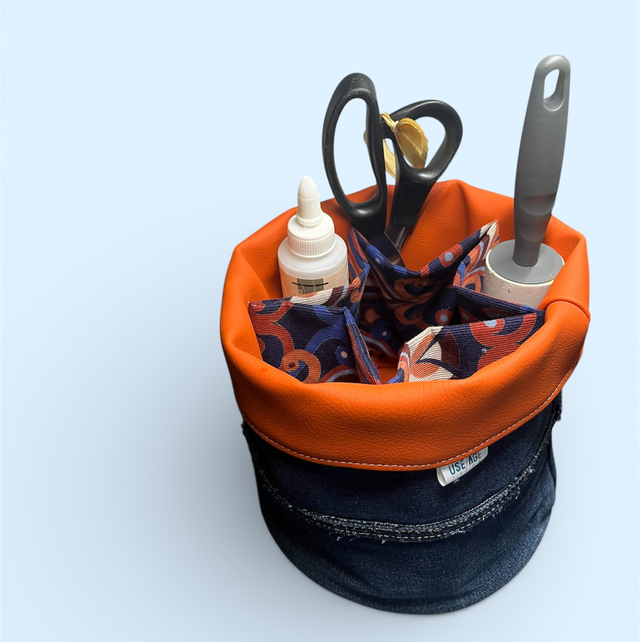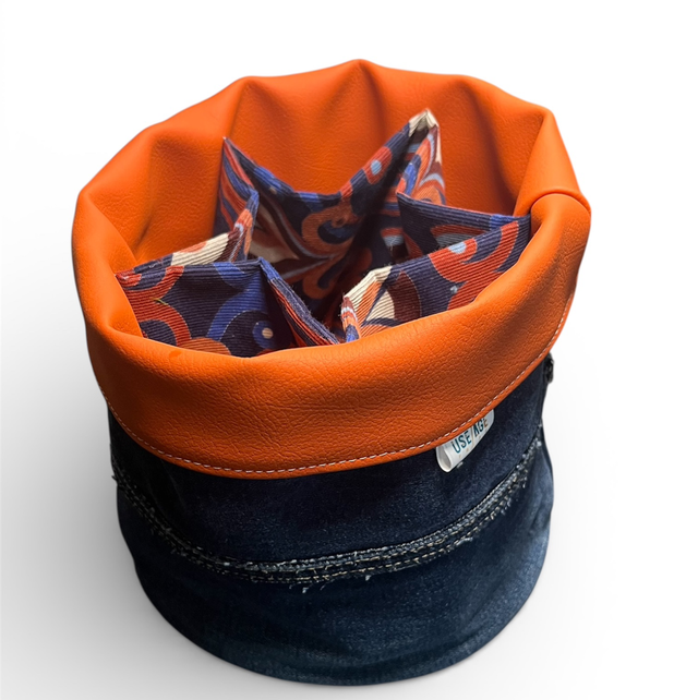 Une panière maline avec 5 poches intégrées pour organiser ton bazar quotidien. Je l’ai conçu en jean robuste avec des poches en tissu d’ameublement et une base en similicuir automobile épais récupéré. Costaud et stylé, il trouve sa place partout.